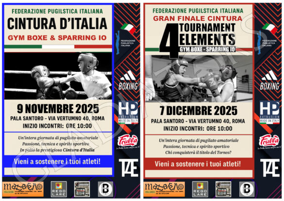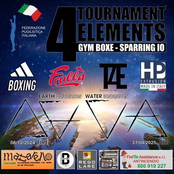 Prossimo appuntamento con il Tournament 4 Elements il 22 febbraio 2025, al Pala Santoro (Via Vertumno 40 Roma) incontri di Gym Boxe, Sparring Io e Pugilato Olimpico …non prendete impegni!