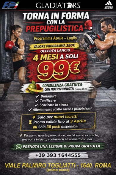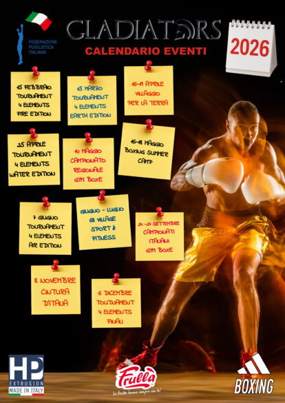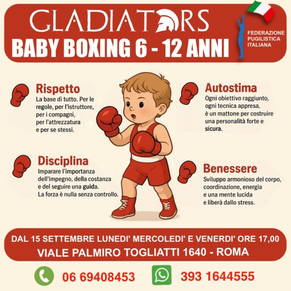 La SSD Gladiators, in collaborazione con il CR Lazio, Presidente Adrio Zannoni e il Responsabile Nazionale Massimo Barone, organizzano il XIX° Corso FPI per il conseguimento della qualifica di Istruttore Amatoriale / Giovanile. Importante novità l’inserimento della qualifica di Istruttore Giovanile che permette in questo modo con unico corso di avere le qualifiche del Settore Amatoriale e Giovanile, poter avviare alla pratica sportiva del Pugilato atleti dai 5 anni ai 65 anni.